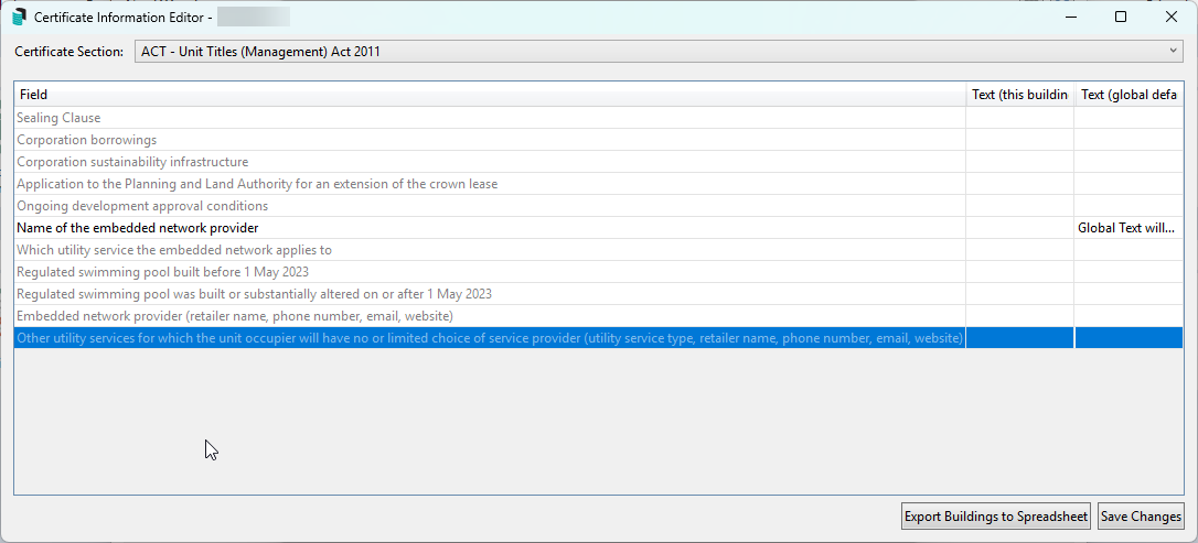 Certificates will automatically be set to the correct certificate based on the State and Module set in the Building Information menu. The Certificate for building type ‘UP’ - ACT Unit Titles Management accommodates the legislative requirements under the Unit Titles Legislation Amendment Act 2020 (The Act) which took effect 1 November 2020.