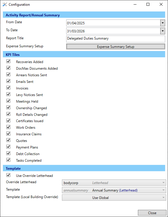 The Activity Report/Annual Summary has configuration available so that the report can be used for a variety of requirements from legislative needs for NSW delegated function reporting, WA Annual Reporting and also more generic purposes.