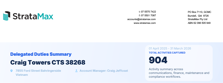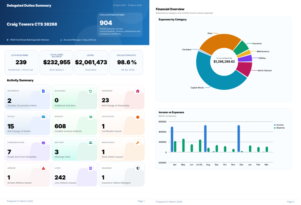The information in this article relates to the setup of the Activity Report/Annual Summary that will be available from all Report Distribution interfaces such as Report Sets, Merge Letters etc in the near future. The report is designed to provide a summary of activities for a specific date range based on key activities within StrataMax; a financial overview is included that will present expenses by category in a pie chart and monthly income and expenditure in a bar chart for the date range set.