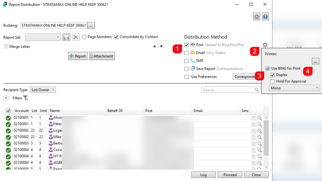 StrataMax can be configured to use the Bing EasyPost API when printing levies, correspondence, or reports from Report Distribution / Merge Letters. When enabled, StrataMax groups all levy notices and related documents for each building and uploads them to the BingMail Customer Portal for review. Including all documents in Report Distribution ensures accurate filing to DocMax and complete logs.