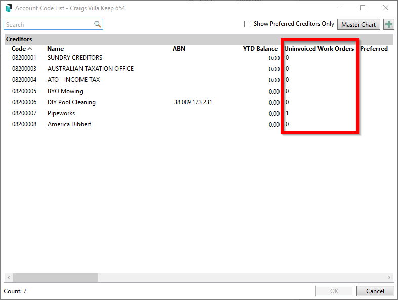 - Work Order count will be included in the Creditor account list to help select the appropriate Creditor & Work Order. The selection of a work order will use the search interface, adding the ability to locate the work order based on all fields.