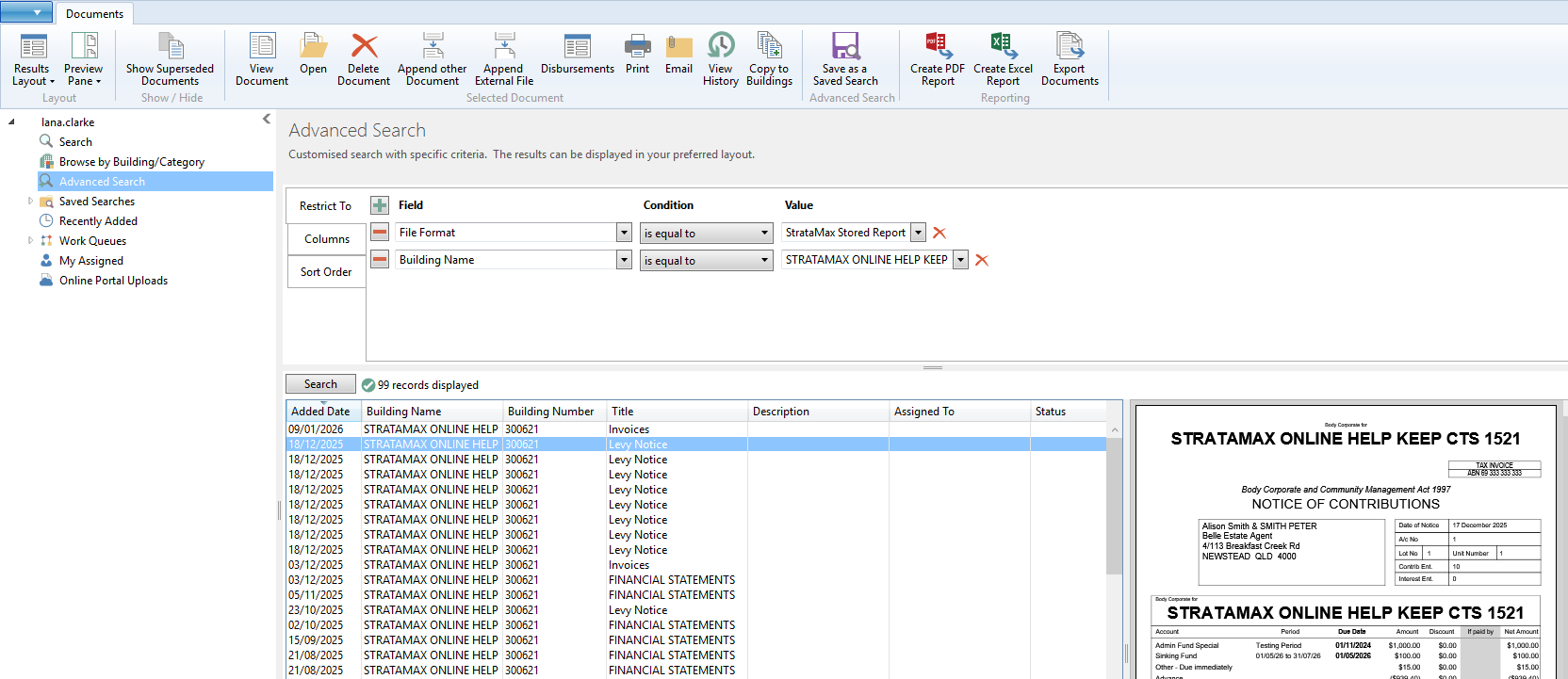 The below provides a framework for DocMax and a saved search that will give the same functionality as what is available in Stored Reports. Information can be checked on a building and lot basis from the Roll from StrataMax.
