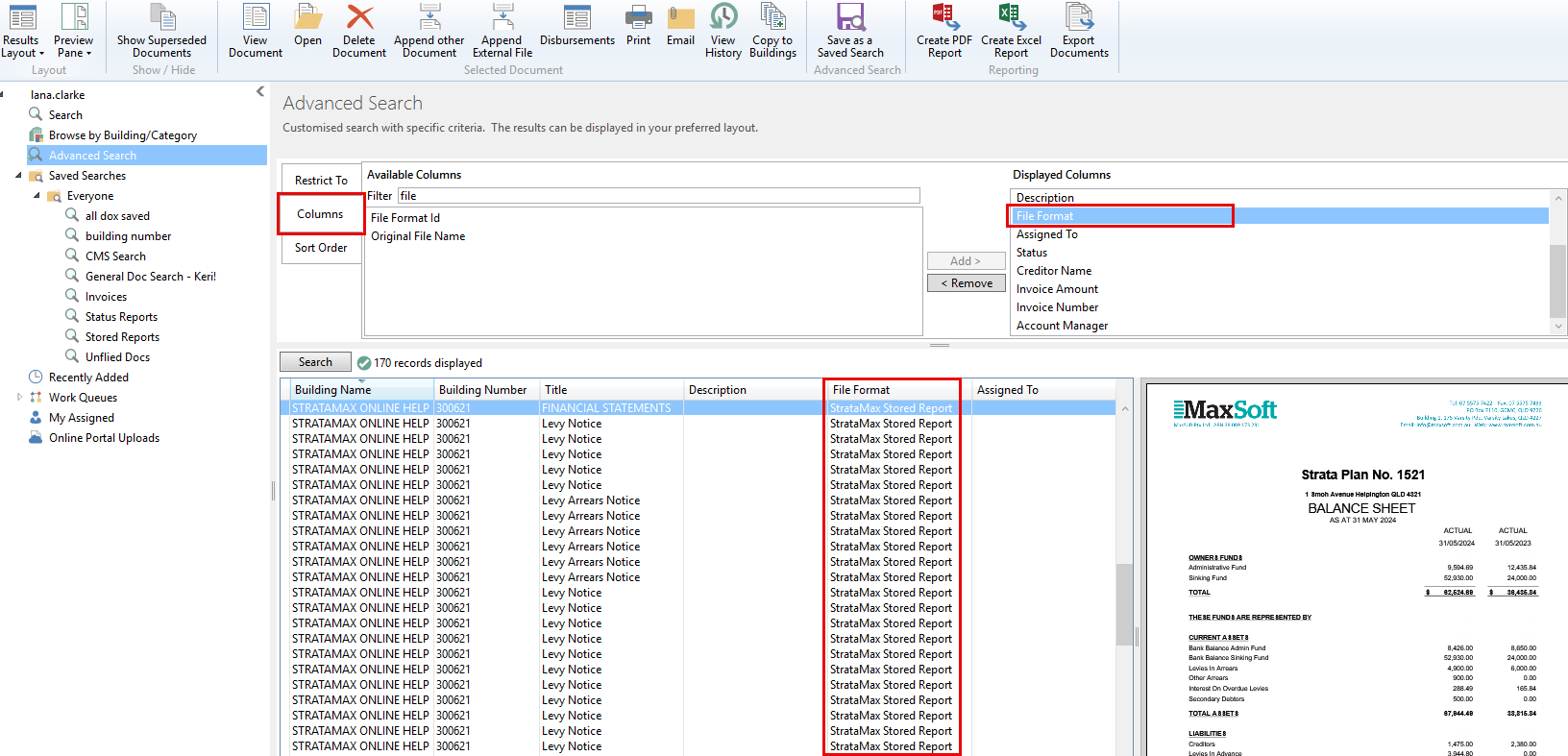 This saved search is for BCMax System documents only. As per step 3, the restriction field: Added From is equal to BCMax System. This will include any Arrerars, Levies, and Ledger Cards and other (BCMax System) documents in the search. There is also a Field titled File Format which can search for or restrict StrataMax Stored Report.