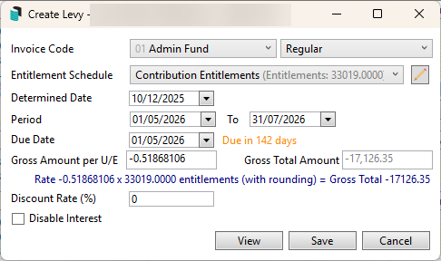 A. Tip is to hover over the levy period to see the calculation. Calculation is the annual rate per unit of entitlement (U/E) and distributed evenly across four quarters, or according to the number of instalments defined.