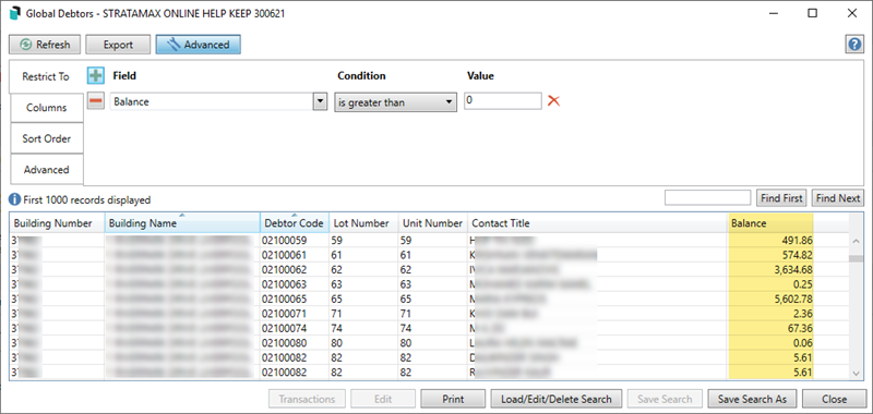 - By default, the fields Reference Name, Given Names and Surname will be applied along with Unit Number and Lot Number. The Global Debtors will include the field Current Building.