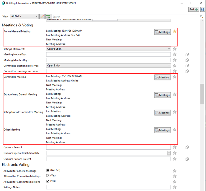 Conversely, Meeting Hub meeting information and documents are automatically synced with the relevant meeting fields in the Building Information screen in StrataMax (StrataMax version 5.6.144 and above). These are specific to each type of meeting (AGM, EGM, etc.), and the sync happens daily, but it's also triggered when a meeting is created, updated or deleted, and when a notice or minutes document is generated. Please be aware that it may take up to 20 minutes for the data to appear in StrataMax.