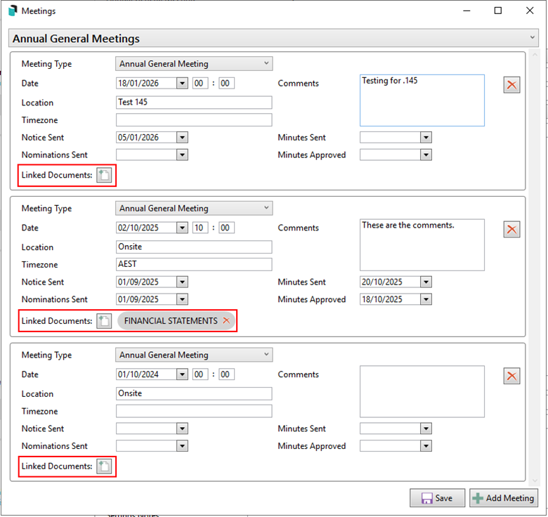 To see the linked documents, click the Meetings button to open Meetings window: