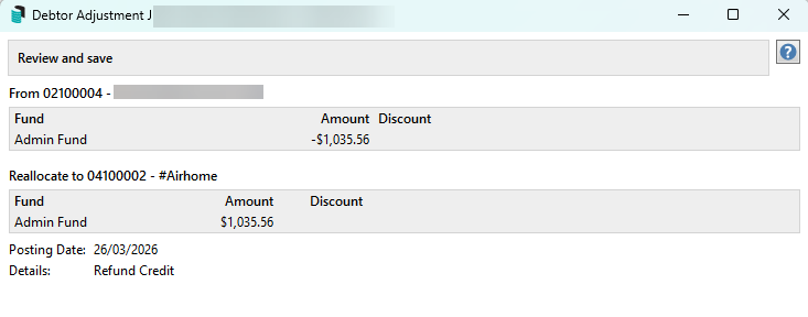 - Search or select Debtor Adjustments, then use Reallocate Funds Between Lots, Second Debtors, and Sub Groups. Move the credit to the second debtor account. Save and finalise.