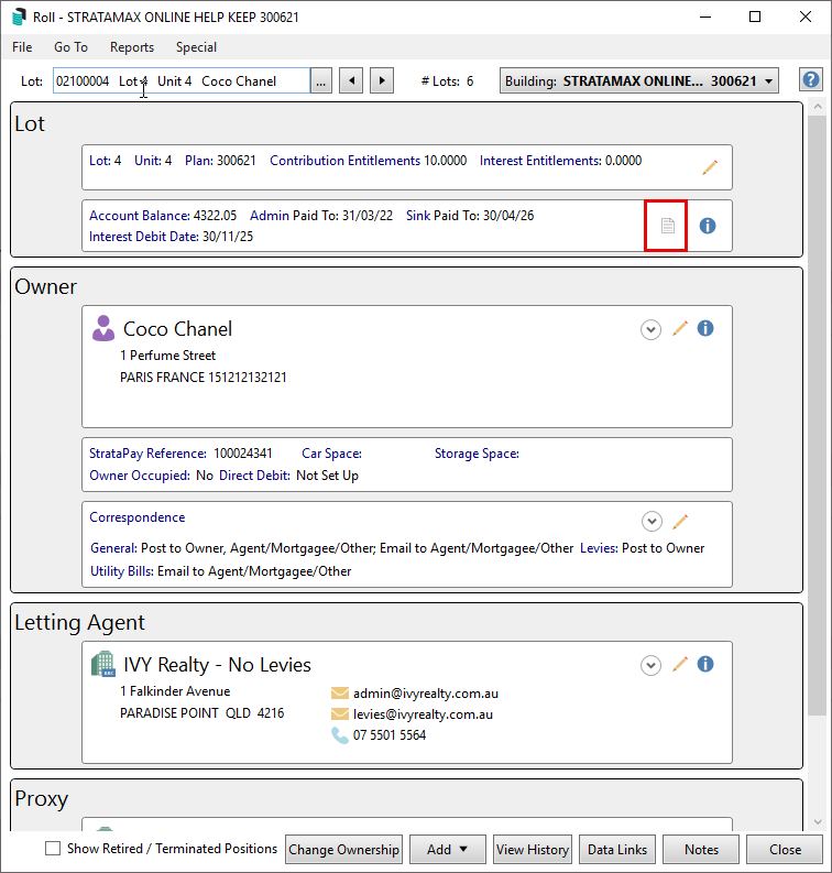 Notes on a lot account can be recorded for lot-specific information, and certain system processes automatically record notes. For example, Arrears and Certificates issued. This area can be used for reporting and is available via Reports / Utilities (Global ). For more information about Notes throughout StrataMax, see the Notes article.
