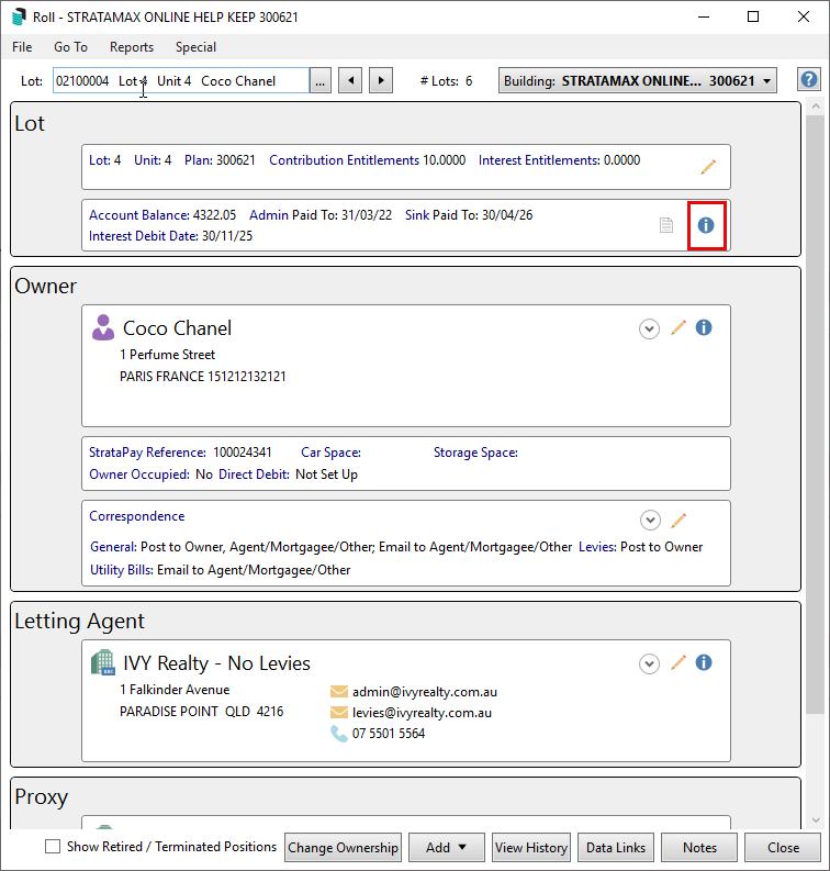 The Roll is used to manage lot owner information, including ownership changes and updates to details. This article details the latest features and functions of this menu, including how to add and edit contacts. A contact is associated with records throughout the system. The same contact can be linked to different screens and menus, such as the Roll and Office Bearers. In addition, multiple contacts can be linked to a single lot.