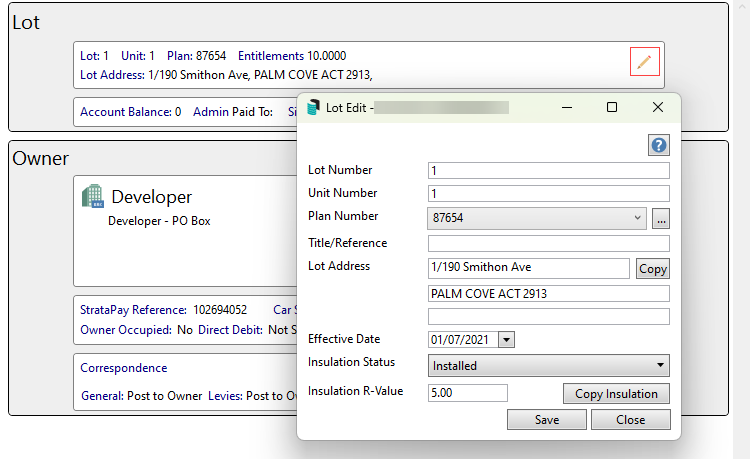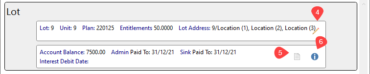 The Pencil in the 'Lot' section icon is for editing the following fields: Lot Number, Unit Number, Plan Number, Title/Reference, and Lot Address. For changes to lot entitlements, you will need to complete a Change of existing lot entitlements.