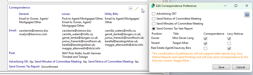 Reporting how an owner receives the levy notice and correspondence can be done in this area, and is dynamic with settings offered for global agents and mortgagees and copies. Each lot will have two rows; one for the Levy Notice and one for the Correspondence (look under the 'Category' column).