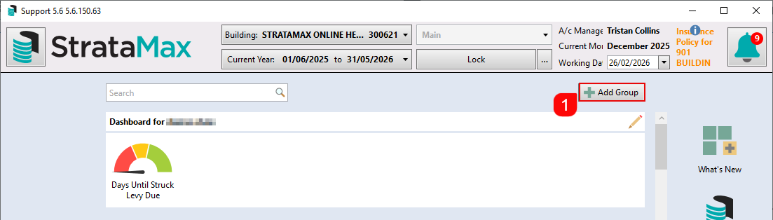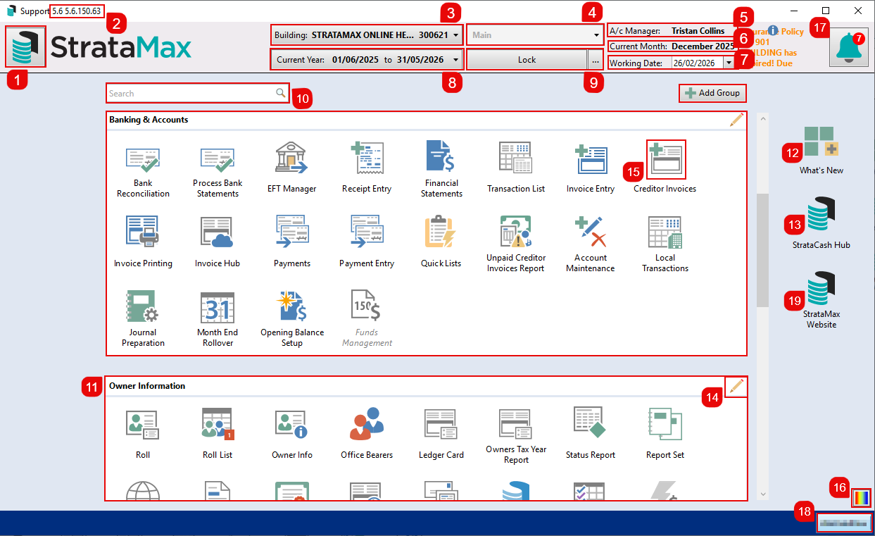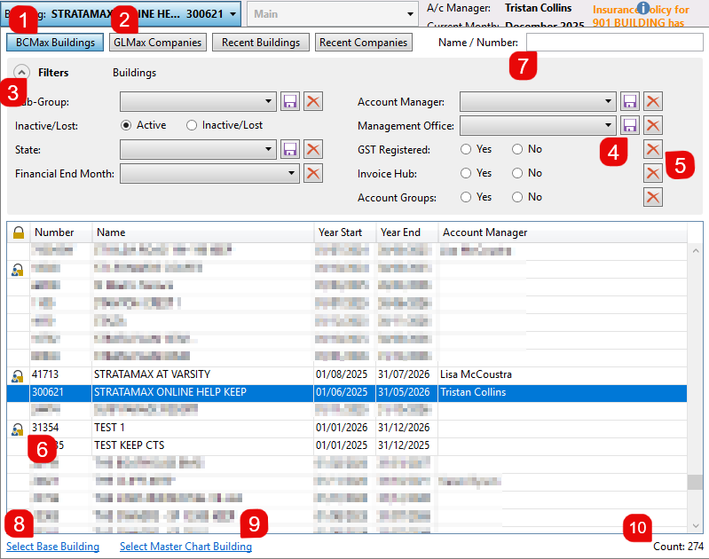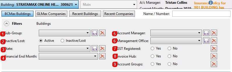 - A/c Manager: Displays the account manager for the currently selected building. The Account Manager is set in Building Information, and more Account Managers can be added to StrataMax in Account Manager Edit.