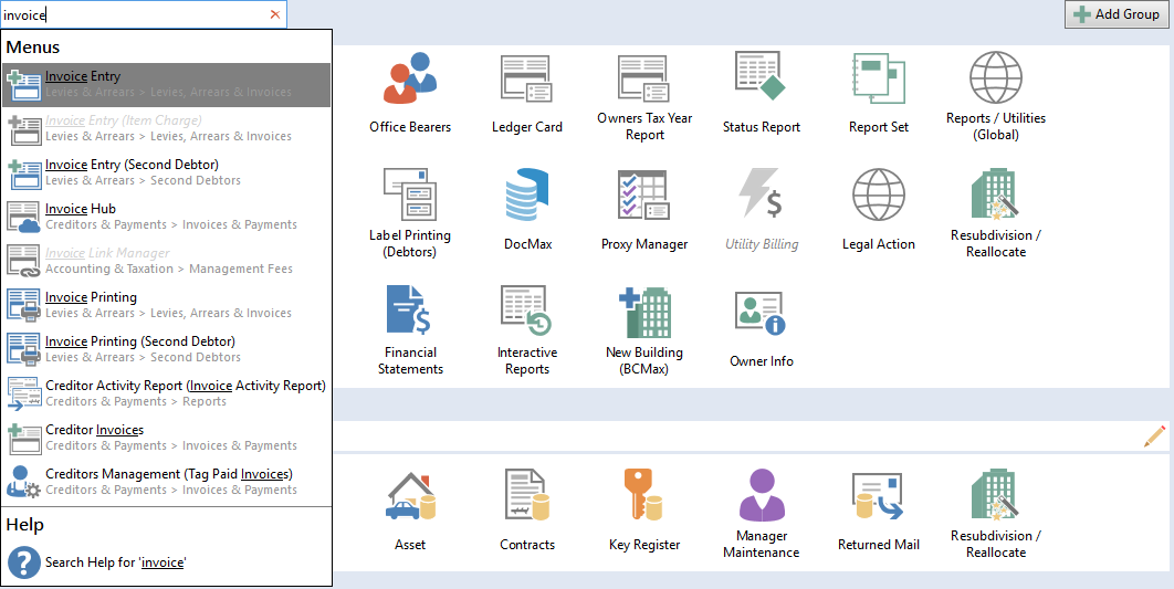 - (Group - italic) Levies & Arrears> Levies (Sub Group - italic) *if applicable, Arrears & Invoices> Invoice Entry ('Menu' item name - Bold - Searched term underlined).